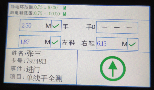 測(cè)試原理: 刷卡(指紋、人臉識(shí)別)后,結(jié)合靜電測(cè)試儀使用,根據(jù)設(shè)定的檢測(cè)項(xiàng)目進(jìn)測(cè)試,數(shù)據(jù)實(shí)時(shí)傳輸?shù)杰浖?,軟件處理接收到的?shù)據(jù)后,向控制器做出應(yīng)答,控制器根據(jù)應(yīng)答做出對(duì)應(yīng)的反應(yīng),比如開門。同時(shí)可以語音播報(bào)和LCD屏幕顯示。
